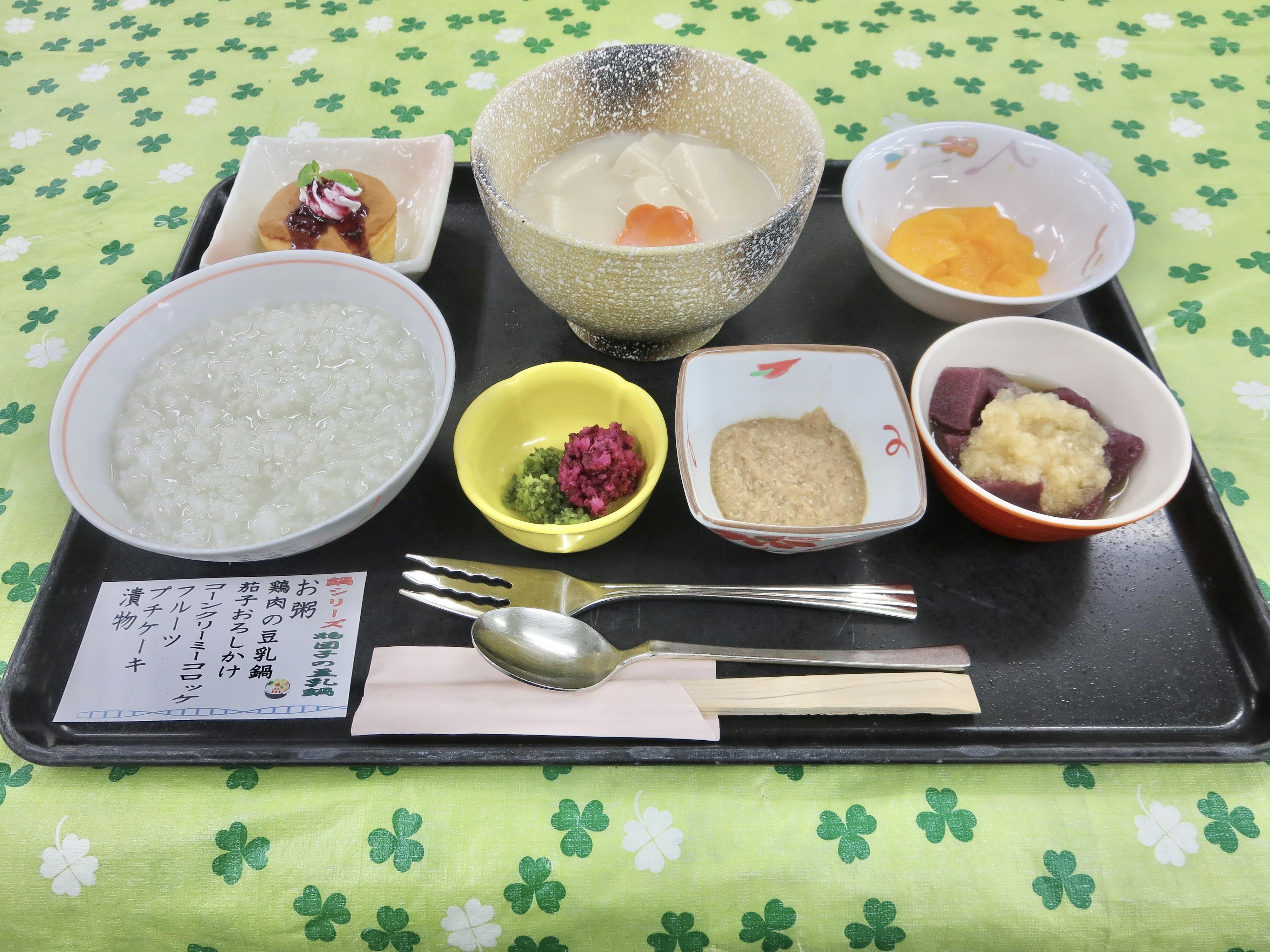 【ロイヤル食】・ご飯・鶏団子の豆乳鍋・茄子おろし和え・漬け物・プチケーキ・コーンクリームコロッケ・フルーツ【ソフト食】・ご飯・鶏団子の豆乳鍋・茄子おろし和え・漬け物・プチケーキ・コーンクリームコロッケ・フルーツ